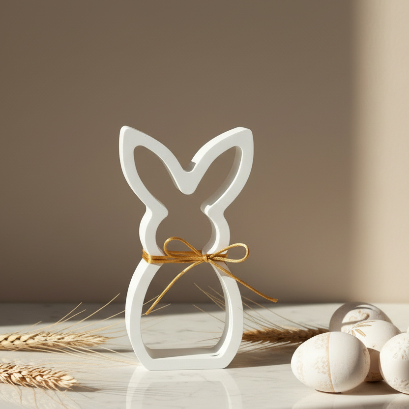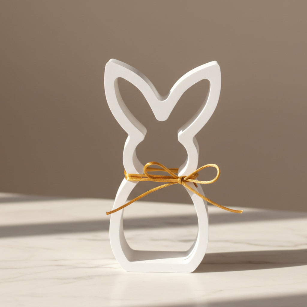 Coelho decorativo vazado com laço dourado para decoração minimalista de Páscoa.