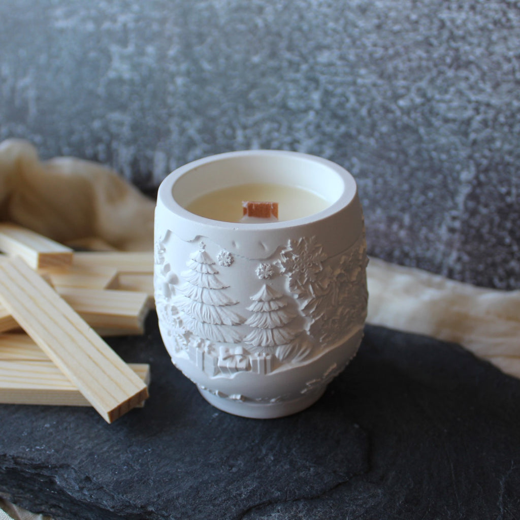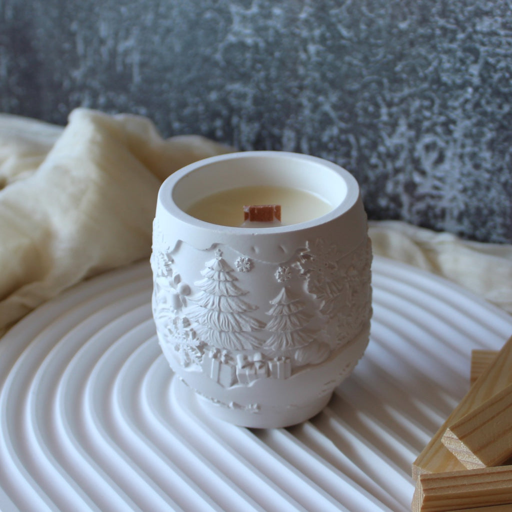 Vela aromática com 140g, em pote de cerâmica artesanal com motivos natalícios em relevo.