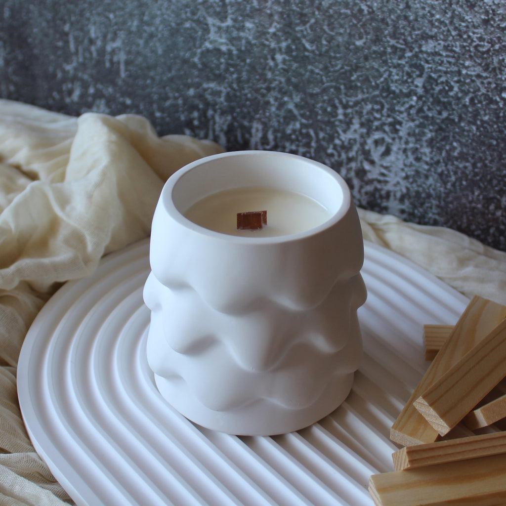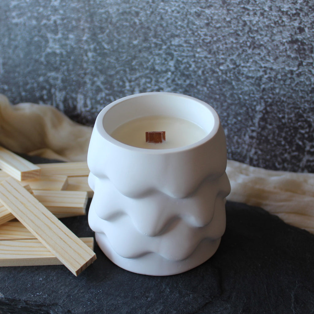 Vela aromática com 220g, em pote de cerâmica artesanal estilo pinheiro nevado.